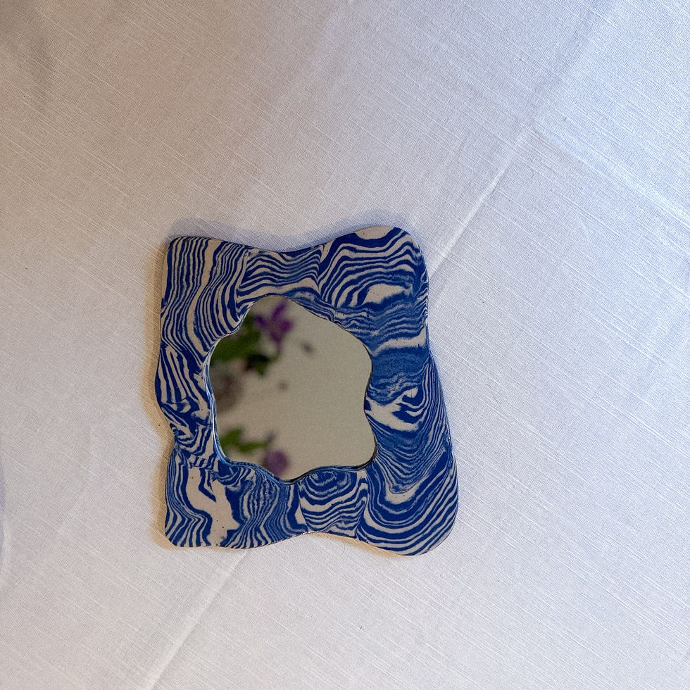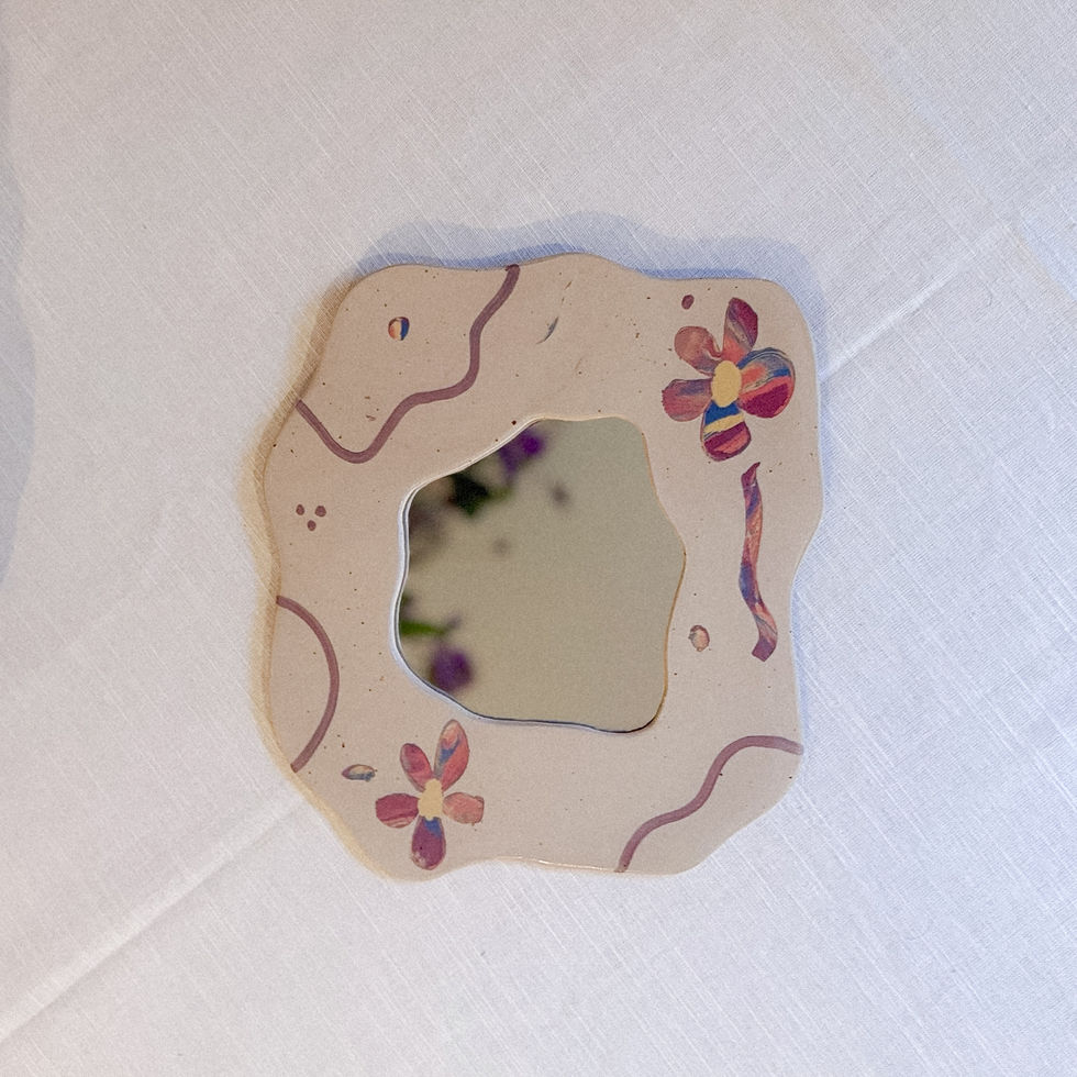 The mirror frames are made by hand in an organic shape using stoneware clay. Available in different colors & sizes. Each mirror is totally unique.
